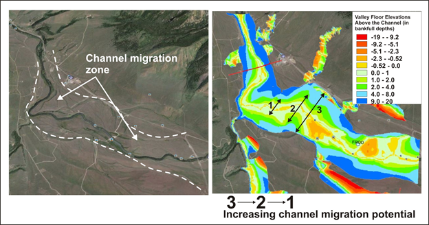 Figure 8. Even using 10 m DEMs, potential channel migration zones can be identified, as illustrated in the Madison River, Montana.