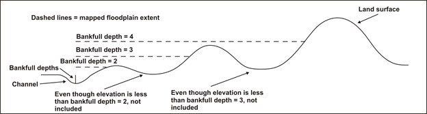 Figure 2. Specifying the number of bankfull depths (elevations) (C in Figure 3) controls the lateral extent of the floodplain that is delineated. Note that interventing high points, if laterally extensive, will limit identification of floodplains as shown in the figure. Hence, a larger number of bankfull depths will capture a larger extent of the floodplain.