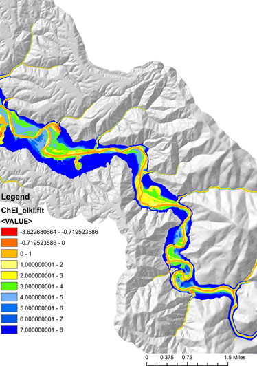 This NetMap tool creates rasters depicting valley surface elevations relative to the channel, using either elevation in meters or increments of bankfull channel depths. The parameter is designed to delineate areas potentially prone to flooding (at varying levels and magnitudes), identify channel floodplain interactions including channel migration areas and avulsion potentia, terraces (of varying elevations), and alluvial (and debris flow) fans.