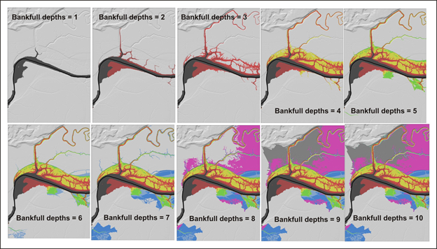 Figure 3. Use of an increasing number of bankfull depths leads to an increase mapped extent of the floodplain (specifying C in Figure 3). Example is from the Matanuska-Susitina watershed in Alaska.