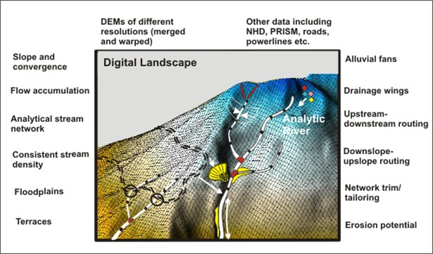 Figure 1. NetMap’s Virtual Watershed consists of a digital terrain model where all terrestrial and riverine surfaces are defined and topologically connected along physical process and biologically relevant pathways.