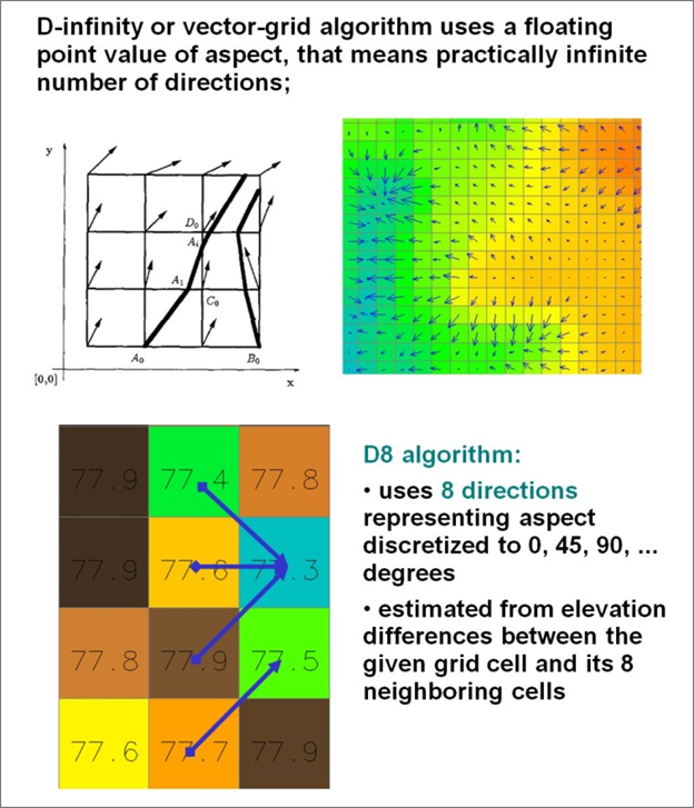 Figure 3. Flow routing on hillsides (unchanneled areas) employs the D-infinity algorithm (top) and flow routing in channels uses the D-8 algorithm (from Mitasova, Geospatial Analysis and Modeling MEA592).