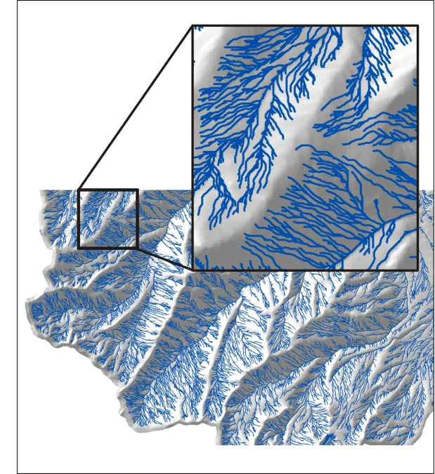 Figure 4. Synthetic stream networks derived from DEMs can have too high a drainage density. Here is an example of a synthetic channel network with “channel feathering”, defined as closely spaced channels on planar hillslopes.