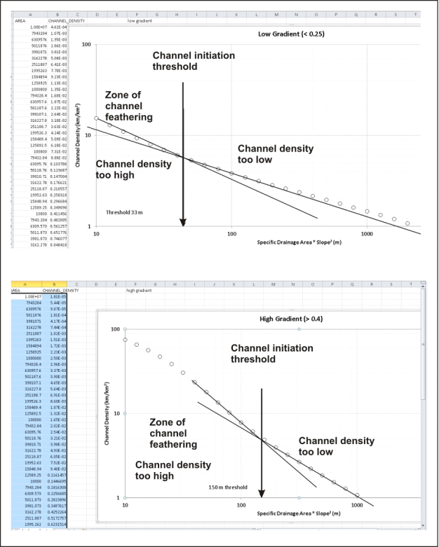 Using both specific drainage area per unit contour length and pan curvature thresholds, a user can manually calibrate the upward extent of channel heads, that is, define the channel density. Too few channels may be created or too many channels. When threshold values are incorrect, there will be “channel feathering” which is manifest as numerous, closely spaced channels extending up on planar hillslopes (Figure 3). The analyst must “calibrate” the thresholds to eliminate or reduce channel feathering (using visual clues of channel locations in landscapes) while providing for a high density of channels. This is done by defining the inflection point between specific drainage area and channel density, given that the threshold for plan curvature is met (Figure 4). The pixel cells that are classified as being a “channel” must extend contiguously for a certain minimum distance, often ranging between 30 to 50 meters, set by the analyst.