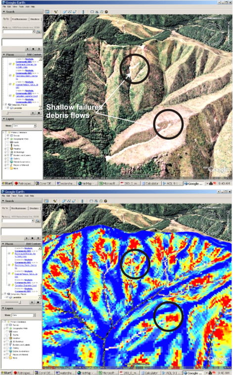 Geospatial information (within a GIS) can be used, also in conjunction with other tools such as Google Earth, to identify relationships between areas of provisional high hazard in a watershed and other resource values.