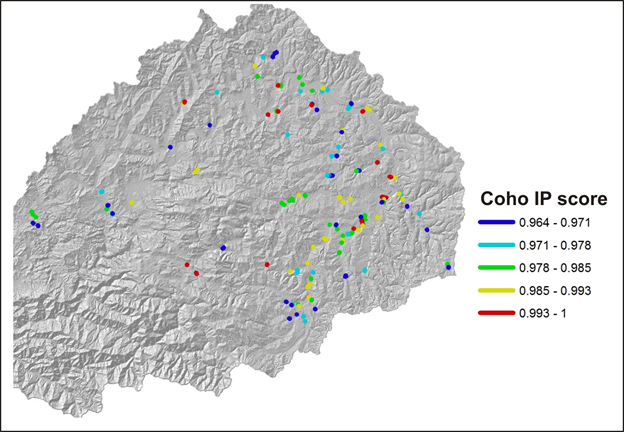 Figure 3. An illustration in the use of NetMap’s overlap tool shows how Road Density (calculated at the scale of individual channel segments, using Drainage Wings, is overlaid on the inherent erosion potential of hillsides (using Generic Erosion Potential), and which is further overlaid on fish habitat quality (Intrinsic Potential). A user selects threshold values for these three attributes (e.g., top 10%, top 5%, top 1% etc.) using the Overlap Tool (Figures 1-2), and reaches where these thresholds overlaps are identified (and in this example, color coded by fish habitat quality). Hence an analyst can quickly identify where in a large watershed, the greatest potential exists for road related impacts on habitats, are located. Field programs or restoration activities can be tailored to match these findings.