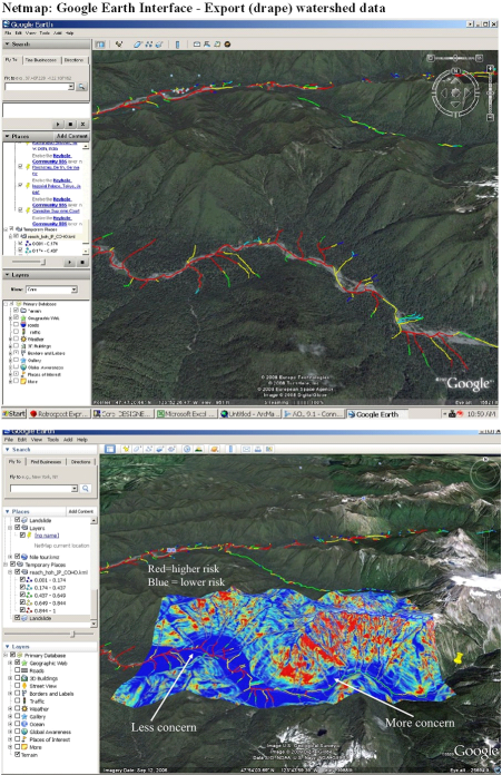 Figure 6. Using NetMap’s Google Earth Tool, users can export watershed attributes such as habitat intrinsic potential for steelhead (Top) and predicted hillslope erosion potential (Generic Erosion Potential). Spatial overlaps between areas of high risk and areas of sensitive habitats can be quickly identified. Example is from the Hoh River basin in western Washington.