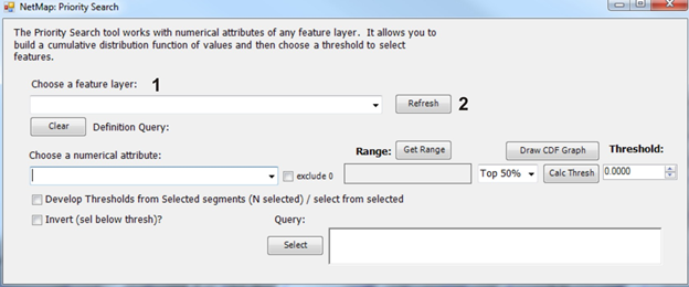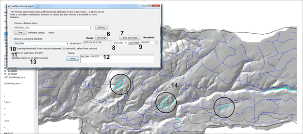 Figure 2. A user then selects an attribute from the drop down (3). If attribute values include zeros, you can exclude those since they will affect the priority search (4). One can get the range of values for the attribute (6), which will not be affected even if zeros are excluded. The full CDF plot can be displayed to help one select a numerical threshold to search for (7). Select from the drop down of percentile (highest 20%, highest 5% etc.). A user MUST calculate the threshold (9) which is then shown in the threshold window. The search can only be conducted on a subset of features (11) and if not checked, all features will be part of the analysis. After pressing "Select" (12) the selection criteria is displayed in the window. The number of features selected is displayed (13) and the selected features are highlighted in the map (14).