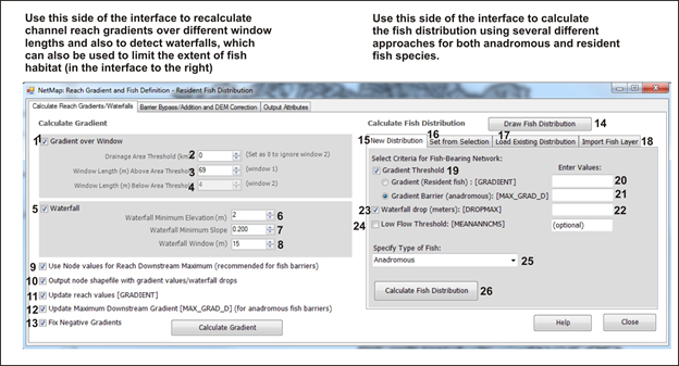 On the right hand panel, a user can specify the elements of the fish distribution (15), or a user can define a fish distribution across only a selected set of channel reaches (16). One can load an existing fish distribution (17), or import another fish layer from which to inform (match) NetMap's fish distribution (18). A gradient barrier for anadromous or resident fish is selected (19) along with specified threshold values (20-21). Resident fish can occur upstream of a specified gradient barrier whereas anadromous fish are limited in extent to below a specified gradient barrier. Waterfall drops can be added as a fish barrier (22-23) but that requires running the waterfall tool on the left side panel of the interface (#5). A low flow threshold can also be specified (24). The type of fish distribution is selected (25) and that gets indicated on all of NetMap tools (e.g., resident or anadromous and by species available in the drop down list). The tool is then run (26).