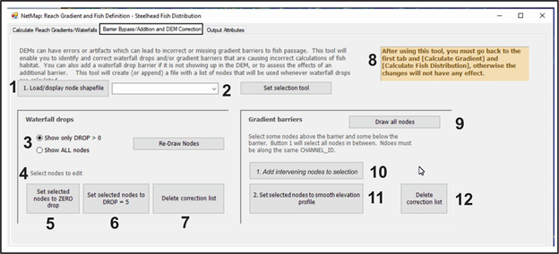 Figure 2. The "Barrier Bypass/Barrier Addition and DEM correction" tool tab allows one to select the node shapefile (1 and 2) (that underpins the synthetic river network at the scale of the DEM) and then to show all waterfall drops > 0 or show all nodes (3). The nodes that need correction (say due to problems with the DEM) are selected (4). Then those nodes (which might + or - elevation changes, but spurious) can then be set to zero drop (5), that way, repairing the nodes that were given wrong values due to problems with the DEM. Or, if an analyst wanted to ADD a fish barrier where none exists in the DEM (for example a dam in a 10 m DEM), the a user can select the node location and set the drop to 5m (6), thereby adding a barrier (or more than one). IMPORTANT: after changing node values in any way, one must return to the "calculate reach gradients/waterfalls" tab and run both the left and right side panels to re-calculate gradients and fish distributions (8). Similarly, gradient barriers (longer channel reaches with steeper gradients) can also be bypassed. (9) All channel nodes are drawn. (10) After identifying the gradient barrier you wish to bypass, select some nodes above and below the barrier. Then, the intervening nodes between the above and below nodes are selected. (11) All the nodes are then selected to smooth the gradient profile and remove the barrier. (12) Deletes the correction node list.