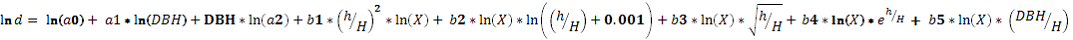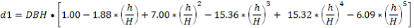 The Waddell taper equation is based on an empirical study of old growth Douglas-fir trees in the Clackamas Ranger District, Mount Hood National Forest, Oregon (1987). Tree diameters (d1, d2, dMid) at a certain height (h) are calculated as a function of relative tree height (h/H) where H is the total tree height and diameter at breast height (DBH) (Eq.6).