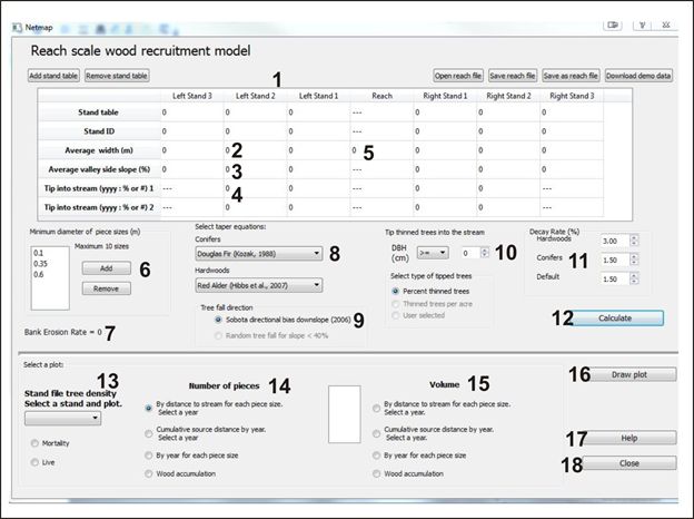 After RSWM calculations are complete, the user can select one plot at a time to show the live or dead stand density from each input stand table in the drop down list (13), the numbers of pieces of wood per 100 m reach (14), or the volume of wood in cubic meters per 100 m reach (15).