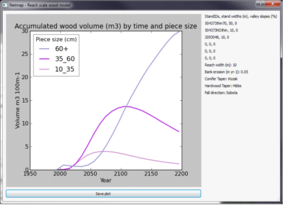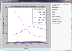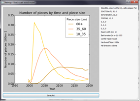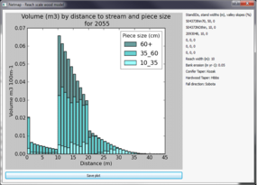 (16) Users can chose to plot the number of pieces or volume of wood by distance to stream for selected piece sizes and by a selected year; by year for each piece size, by cumulative source distance by year, and wood accumulation over time (Figure 4). The user can save a plot to a .pdf or a .png file or build custom plots from the output file. When a plot is drawn, RSWM writes a text file containing the information in the plot. Stand density files are called either TPHLivexxx.txt or TPHDeadxxx.txt, where xxx is the stand ID: e.g., TPHDead504373thin70.txt. Files for distance to reach plots are called NPbyD2Syyyy.csv where yyyy is the 4 digit year, e.g., NPbyD2S1995.csv is the number of pieces by the distance to the stream for 1995. Files for the pieces size by time plot are called PieceSizeByTime.csv. OutTotalxxx.csv is the complete record of model calculations for each run; xxx is a random number so that this file is not overwritten. RSWM also writes to reach.txt with the details of the run and this is overwritten for each model run.
