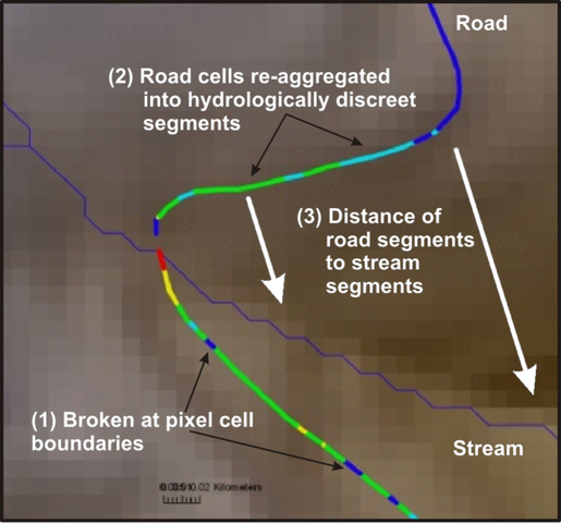 The WEPP road surface erosion model is used within NetMap; refer to (http://forest.moscowfsl.wsu.edu/fswepp/) for additional information. The road network (lines) is first broken at pixel cell boundaries (Figure 1). The individual, approximately pixel scale road cells, are then re-aggregated into hydrologically connected segments (tens to a hundreds of meters in length) that represent water flow paths from high (topographic) points to low (pour) points or to defined streams. These hydrological road segments can be viewed in terms of their drainage diversion potential. For example, in the absence of secondary road drainage structures, the drainage diversion road segments should indicate the water diversion potential of any road segment, particularly under conditions such as during large storms or following wildfires. Refer to NetMap’s Road Drainage Diversion Potential parameter.