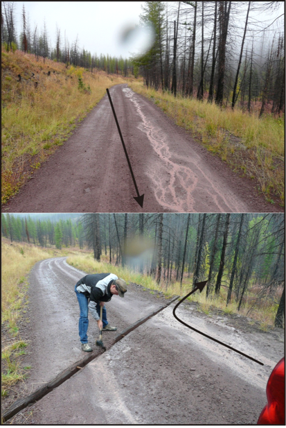 Figure 3. (Top) Long stretches of road can be hydrologically connected, via overland flow. In the Clearwater River basin that can lead to considerable surface erosion and the delivery of both fine sediments and other materials (nutrients) to streams. (Bottom) The use of cross drains (a form called ‘open tops’ in the photo) can be used to decrease the length of overland flow and thus decrease the amount of surface erosion and the volume of sediment and other materials reaching stream channels. Arrows illustrate the accumulation of flow and its disruption due to the cross drain, during conditions of light rain.