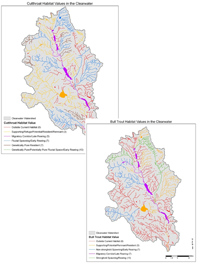 Figure 7. Habitat distribution and values for cutthroat and bull trout in the Clearwater basin (source: MTFWP; Rieman et al., 2012).