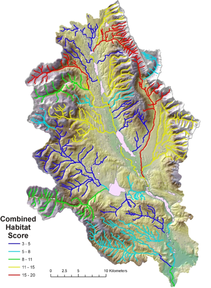 Figure 8. The stream habitat values for cutthroat and bull trout (Fig. 2) were combined into a composite score for use in NetMap.