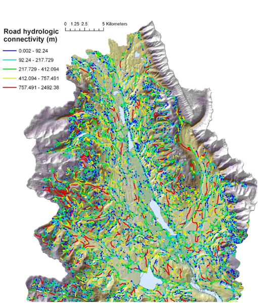Figure 9. Predicted road hydrologic connectivity ranged between ten and 2500 meters (average 133 m). This parameter, during large storms or following fires when secondary drainage structures may be compromised, could be viewed as an index of ‘road drainage diversion potential’. The drainage diversion index could be used to identify locations where field crews could check on drainage efficacy during or after storms or following fires.