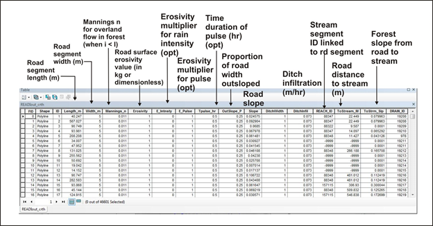 READIoutSim_ID = road layer (READI_ID) with output attributes including sediment production and sediment delivery to streams (see output ArcMap attribute tables below)