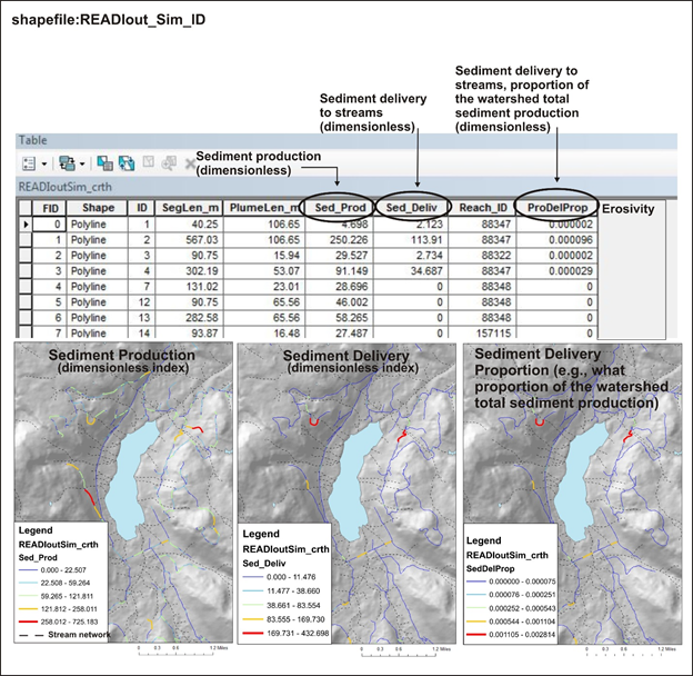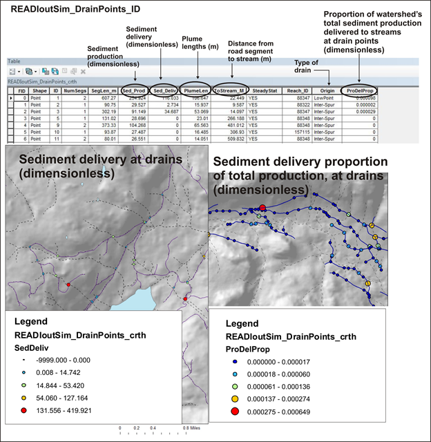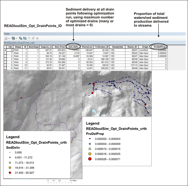 READIoutim_OPT_DrainPoints_ID = model output with attributes including sediment production and sediment delivery to streams (see output ArcMap attribute tables below)