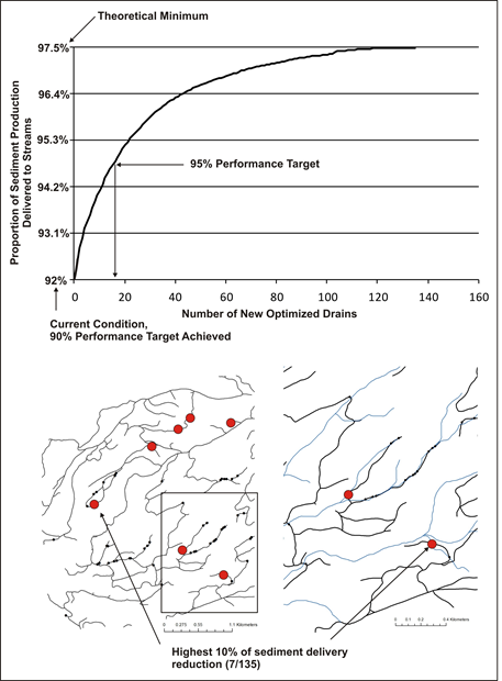 Figure. Optimized new road drain locations (added to natural Figure. Predicted sediment delivery following new drain optimization.