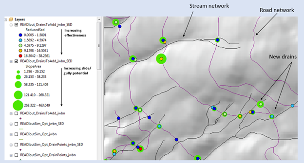 READI reduced sediment for new optimized drains overlaid onto predicted slope area product indicating the relative likelihood of new drain runoff to trigger gullies or landslides.