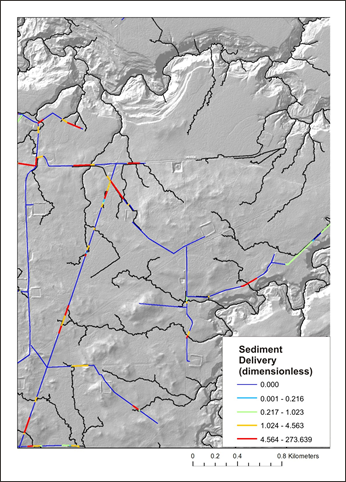 We also recognize that analysis tools must provide calculations of sensitivity to changes in the parameters that influence runoff, sediment production, and delivery to the channel system. This capability can show how uncertainty in input values influences predicted patterns of sediment production and delivery. It can also show where changes in road characteristics, such as surface material or drain spacing, might have the greatest effect on spatial patterns of sediment delivery to channels.