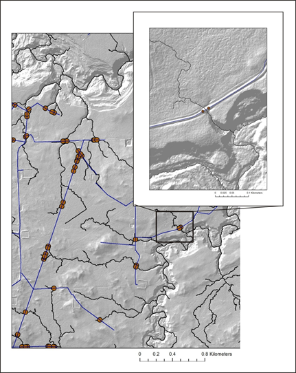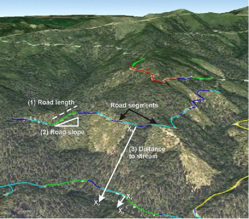 To fully characterize road-channel interactions, analysis tools must operate over entire watersheds. To fully characterize road-ecosystem interactions, analysis tools must operate over multiple watersheds. We focus here on watershed-scale interactions. To do so, we need spatially referenced information for road and channel locations that is linked to basin topography. For this, we rely on the concept of a virtual watershed (Barquin et al., 2015; Benda et al., 2016): a digital representation that explicitly links channel networks to the landscapes they drain. Using NetMap (Benda et al., 2007), a software platform that implements a virtual watershed within a GIS and provides facilities for linking different hydrologic and geomorphic models, we can drape a vector road network onto a digital elevation model (DEM, Figure 1) and parse roads into discrete hydrologic segments, extending from a high point to a low point along the topographic profile traversed by the road (Figure 2). Road segment length and gradient are calculated, and the flow-path to the nearest stream channel is characterized. This capability provides the foundation on which to build a template for road-network analyses.