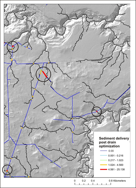 An analyst can use the attributes in the "drains to add" shapefile to prioritize placements of new drains to eliminate or reduce sediment delivery. See figures below.