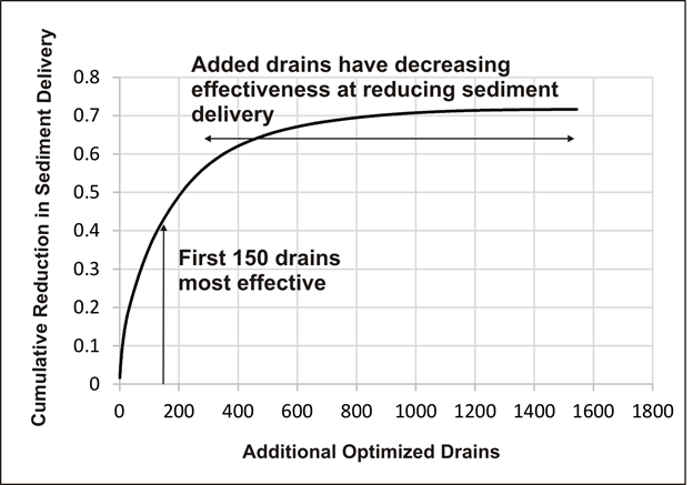 New optimized drains are ranked according to effectiveness, the first ones in the queue are the most effective at eliminating or reducing sediment delivery, their effectiveness drops off with increasing number of drains, see example below.
