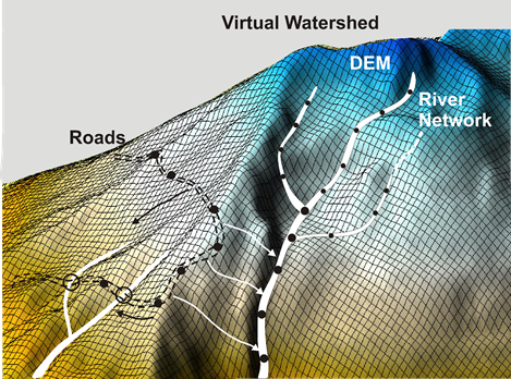 Our goal is to create a numerical template for road-network analyses that can be used to anticipate effects of roads on channel characteristics and associated aquatic habitat. For this, we seek a conceptual representation of how road networks interact with processes of water and sediment movement in the context of basin topography, geology, and climate. We seek a parsimonious representation, so that it can be applied in areas with limited data to gain insight about these interactions, but must still include the primary factors that drive water and sediment production and delivery from roads to channels, so that it can reproduce the types of behavior observed in actual, real-life systems.