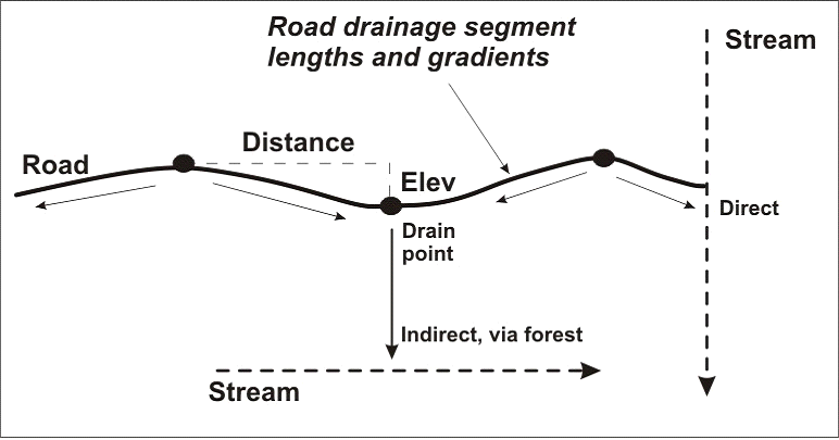 For road segments that drain to a stream crossing, all water and sediment enter the stream. For road segments with drain points onto the forest floor, discharge of water to the stream is assumed proportional to the ratio of potential plume length and the flow distance to the stream: