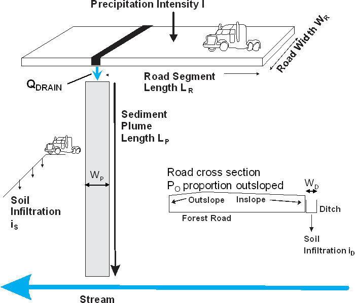 Empirical studies highlight the variability and uncertainty in measures of sediment production and delivery to streams from road networks, but they also identify a set of processes by which sediment production and delivery occur. Sediment production from roads is driven by road-segment hydrology (Surfleet et al., 2011), which can be grouped into two primary runoff-generating processes: 1) infiltration excess overland flow on road surfaces, and 2) interception of shallow-subsurface saturated flow by cut banks (Wemple and Jones, 2003). Surface water generated through these processes flows over road and cut-bank surfaces, and through ditches, collecting sediment from these surfaces as it goes, and potentially eroding rills and triggering cut-bank slumps. Sediment-bearing water is then discharged directly to streams at stream crossings, or onto the forest flow where it may continue flowing as overland flow, leaving a plume of sediment in its wake (Hairsine et al., 2002; Ketcheson and Megahan, 1996), or in certain conditions, it may incise gullies or trigger landslides and debris flows (Montgomery, 1994). For now, we focus specifically on infiltration excess overland flow and overland-flow plumes of water and sediment emanating from drain points, but recognize that these other processes must also be included for a complete characterization of road-channel interactions (Jones et al., 2000).