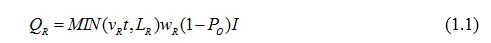 Here vR is average flow velocity over the road, t is time since beginning of rainfall, wR is width of the road prism, PO is the proportion of the road surface that is outsloped, so that wR(1-PO) gives the effective width of the road prism that contributes discharge to the drain point, LR is road-segment length, and I is rainfall intensity. We assume no infiltration into the road surface and make no accounting for depression storage, although such factors could be included in Equation .