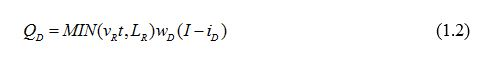 With this simple model, discharge at the drain outlet increases linearly from initiation of the storm (t = 0) either until the time-to-concentration of the road segment (TCR = LR/vR), or for the duration of the storm D, whichever is shorter. If storm duration exceeds time-to-concentration (D > TCR), discharge remains constant from TCR until D. When the storm ceases at time t = D, discharge decreases linearly to zero at the rate vRwRIt over time interval TCR or D, whichever is smaller. We have applied the same average velocity for flow over the road surface and through the ditch. Channelized flow through a ditch is much faster than overland flow on the road surface, but generally the time-to-concentration for a road segment is considerably less than the storm duration, so that flow velocity has minor effect on total discharge.