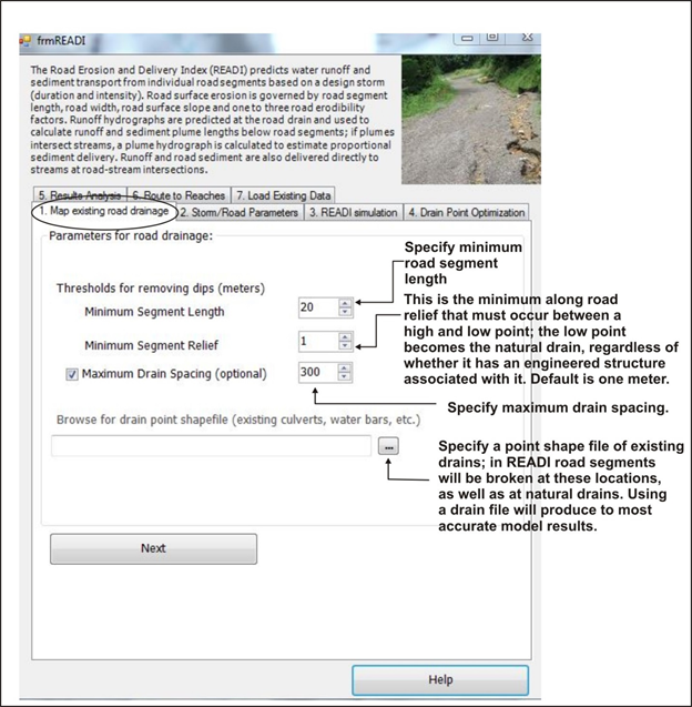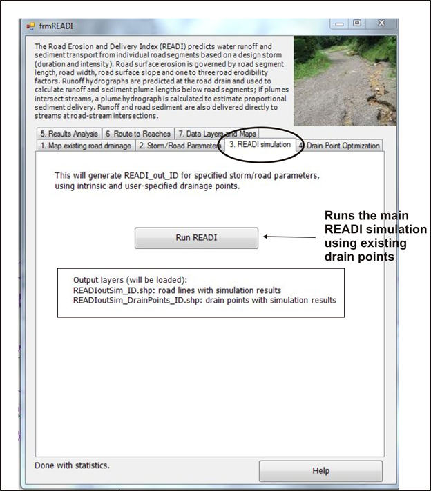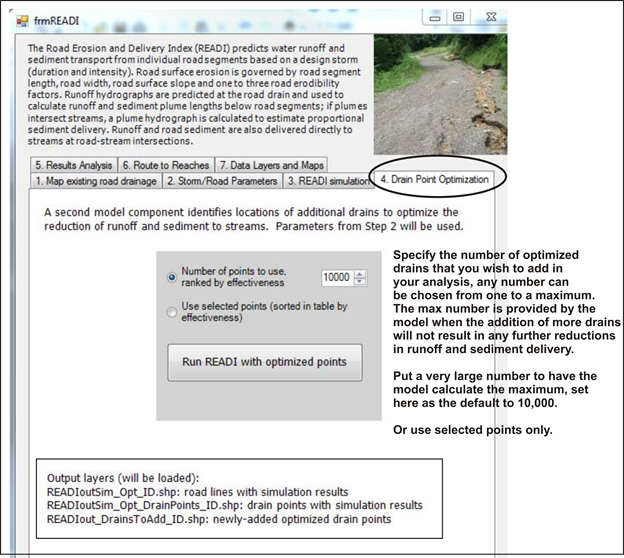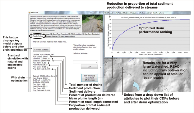 Additionally, READI includes an optimization component that is used to predict where additional road drains can be strategically placed to further disconnect road segments from streams and where road maintenance and upgrades can reduce sediment delivery. When using READI to predict location of new drains, one MUST consider the potential for the new drain runoff to trigger gullies, landslides and debris flows. See below for a description of READI in the context of slope stability.