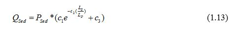 Here PSed is the sediment production rate specified in Equation , LS is flow distance to the stream, LP is the potential length of the plume specified in Equation , e is the base of the natural algorithm, and c1, c2, and c3 are empirically determined coefficients. Total sediment delivery is calculated as the integral of equation over time.