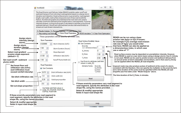 Parameter Description: The ability of roads to generate runoff, surface erosion and sediment delivery to streams is predicted by NetMap's READI model. At the scale of individual road segments, READI can be used as a dimensionless index on inherent erosion potential to prioritize road segments for field validation, maintenance and remediation, but calibration to field measured erosion rates can increase accuracy and be used to predict sediment yields (e.g., kg/storm or t/storm or dimensionless units/storm; the time unit is "storm" since READI is run on a per storm basis, typically a "design storm". READI can also be calibrated using field measured sediment transport distances or sediment plume lengths. READI can be run over mutlipe storms, manually, to calculate a per annum sediment yield.