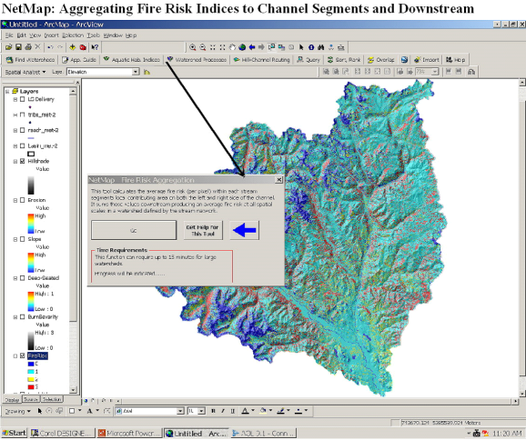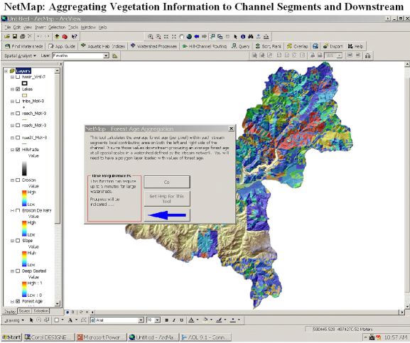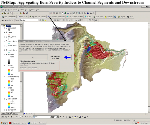 Tool Description: Any NetMap channel hillslope attribute (raster or grid) can be aggregated or routed (length weighted average or summed) downstream, revealing patterns at any spatial scale defined by the channel network (see Routing of Hillslope Attributes). In this version of the tool, a user selects a buffer (width) from which to select only those hillslope attributes that fall within it, to report to channel segments and to route downstream.