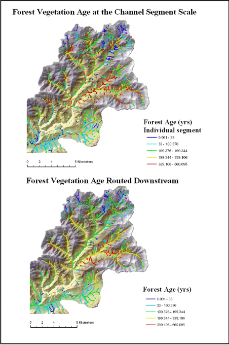 Figure 2. NetMap analysis of forest age as reported to individual stream segments (upper) and routed downstream (lower) revealing patterns of forest age at any spatial scale defined by the river network.