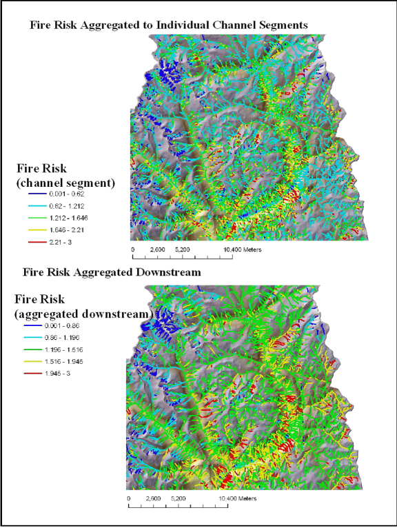 Figure 4. NetMap analysis of fire risk as reported to individual stream segments (upper) and routed downstream (lower) revealing patterns of fire risk at any spatial scale defined by the river network.