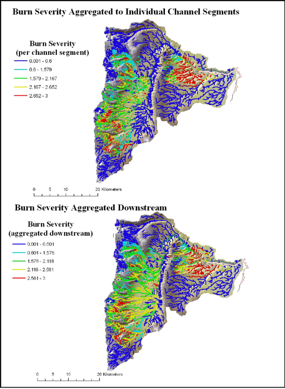 Figure 6. NetMap analysis of post fire burn severity as reported to individual stream segments (upper) and routed downstream (lower) revealing patterns of burn severity at any spatial scale defined by the river network.