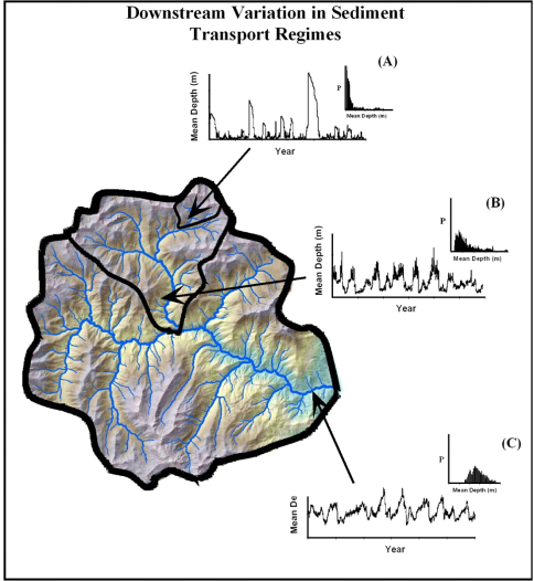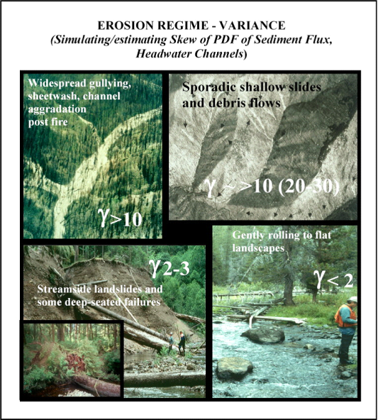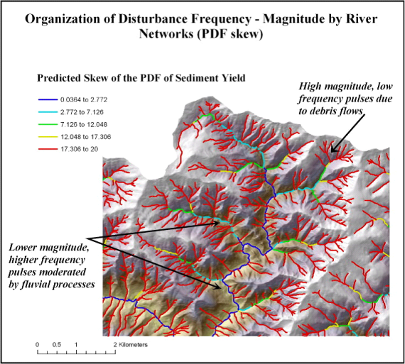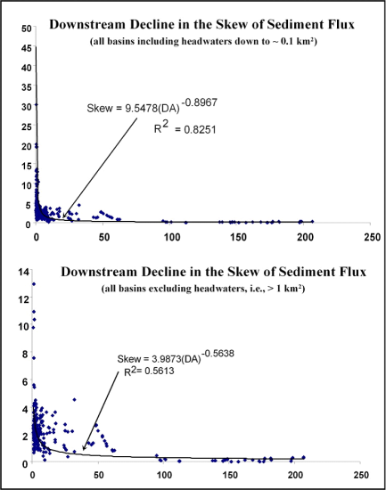Figure 3. The skew of the probability distribution (PDF) of sediment flux in a mountain drainage basin provides an indication of the erosion and sediment transport regime. A PDF with high skew (>5 and up to 20 or 30) may indicate a regime characterized by high magnitude and low frequency events driven my mass wasting, such as debris flows in headwater channels or post fire gully erosion. A PDF with low skew (<5 to less than 1) indicates a regime characterized by lower magnitude but higher frequency events driven by more frequent storm-based fluvial processes. Based on stochastic simulation modeling of erosion and sediment flux over centuries in a humid mountain drainage basin (Benda and Dunne 1997a,b), the skew of the probability distribution (PDF) of sediment yield decreases non linearly downstream. Thus, sediment-related disturbances should tend to be larger (with respect to the channel and valley floor) but of lower frequency in upper portions of networks (i.e., mass wasting generated sediment supply) and of a lower magnitude but of higher frequency in lower portion of river basins (i.e., sediment supply dominated by in-stream fluvial processes).