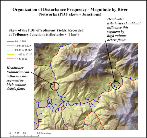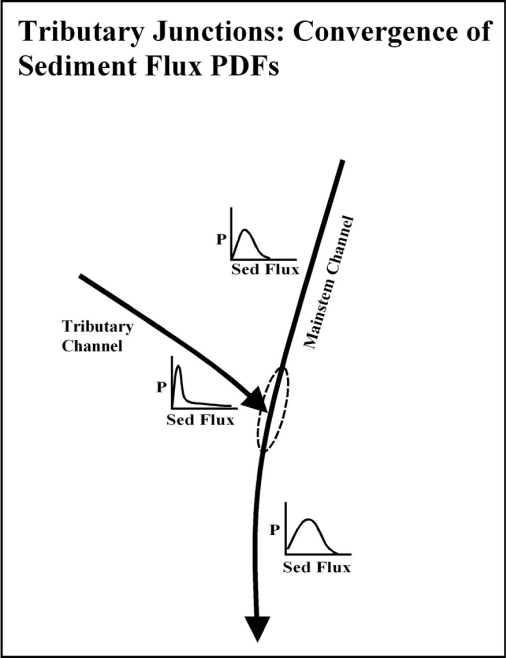 Sediment disturbance regimes, that can be characterized by PDFs of sediment yields, converge at tributary confluences (Figure 6). Although the skews of PDFs in mainstem river segments represent the larger channel’s sediment regime, often it is the skew of the PDF of the confluencing tributary that has significant morphological consequences in the mainstem channel segments (at and immediately up- and downstream of confluences) (Benda et al. 2004a,b). For example, debris flows reflect a highly skewed PDF of sediment flux and they are responsible for creating large morphological changes in channels and valley floors of mainstem rivers (Benda 1990, Grant and Swanson 1995, Hogan et al, 1998, Benda et al. 2003, Bigelow et al. 2007); also see NetMap’s ‘Confluence’ parameters in the ‘Fluvial Morphology Module’.
