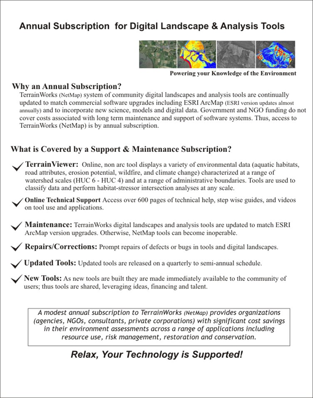 Without continuous software updates and repairs, and coding updates to match NetMap's host ArcGIS (ArcMap) software, NetMap tools will become non functional. Government and NGOs do not fund data and software support and maintenance, thus risking the continuity of data and assessment capabilities, including those they may have originally funded. Consequently, NetMap’s Virtual Watersheds and analysis tools have evolved into a subscription system to ensure the long term sustainability of the community based analysis platform. Modest annual subscriptions are required to access the Digital Hydroscapes coupled with tools (and the TerrainViewer) including with Support and Maintenance. Support and maintenance include keeping abreast with host ESRI ArcMap software, tech support, database repairs, bug fixes, tool updates, new tools and TerrainWorks Viewer.
