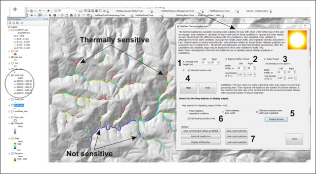 NetMap presently does not contain a stream temperature model because of the site specific nature of the empirical calibration needed (water temperature) that is needed to make accurate stream temperature predictions. NetMap’s thermal load tool can inform stream temperature models.
