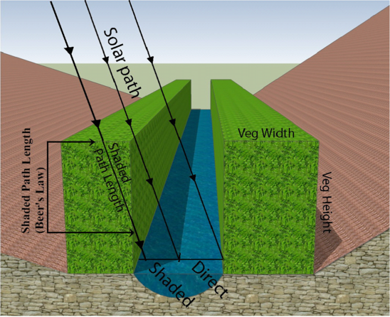 The shaded portion of the stream is divided into two portions – that which receives sunlight through a portion of the canopy, and that which receives sunlight through the full width of the canopy (generally only very early or late in the day). For each of these portions, we calculate an average path length of the sunlight through the canopy. The bare earth radiation is attenuated using the shade factor and path length (using Beer’s Law), and applied to the affected channel surface area (Figure 11).