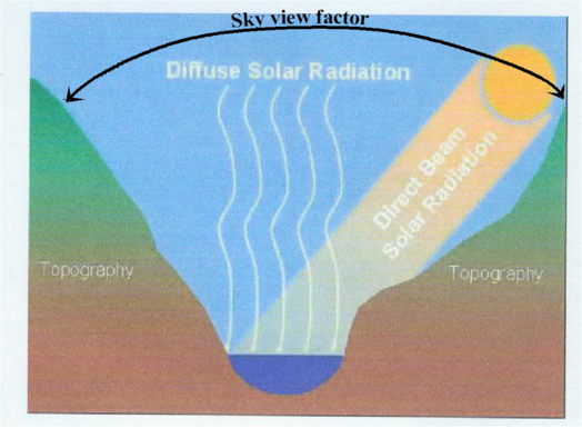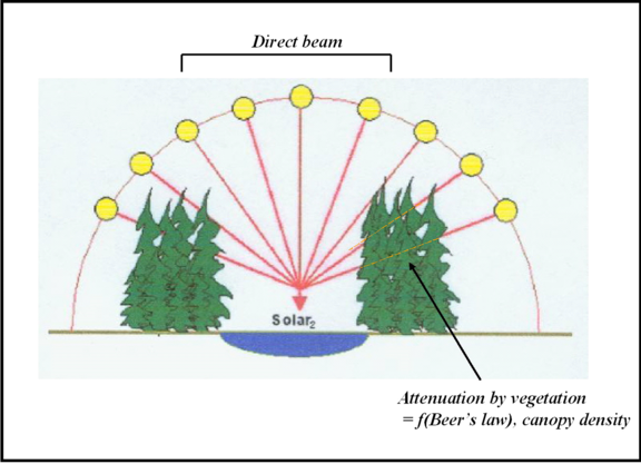 Figure 12. The solar components controlling thermal loading to streams include direct beam solar and diffuse solar radiation. Figure modified from Boyd and Kasper 2003, 2007.