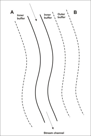 Figure 11. A sketch showing the geometry of light transmission to a stream including unobstructed direct incident radiation and light attenuated through a vegetative zone or buffer. The path length through the vegetation is a function of vegetation or buffer width, stream aspect, solar altitude and solar azimuth. Attenuation follows the principles embodied in Beer’s Law (Oke 1978).
