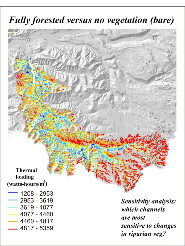 Figure 3. NetMap's thermal tool is used to calculate a sensitivity analysis - which channels, if riparian vegetation was removed or decreased, would be the most sensitive. In watt-hours/m2.